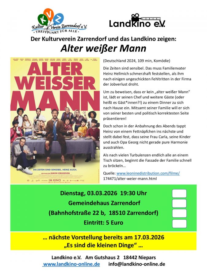 - +++ 03.03.2026 19:30 - Der Kulturverein und das Landkino zeigen - Alter weißer Mann - Gemeindehaus Zarrendorf